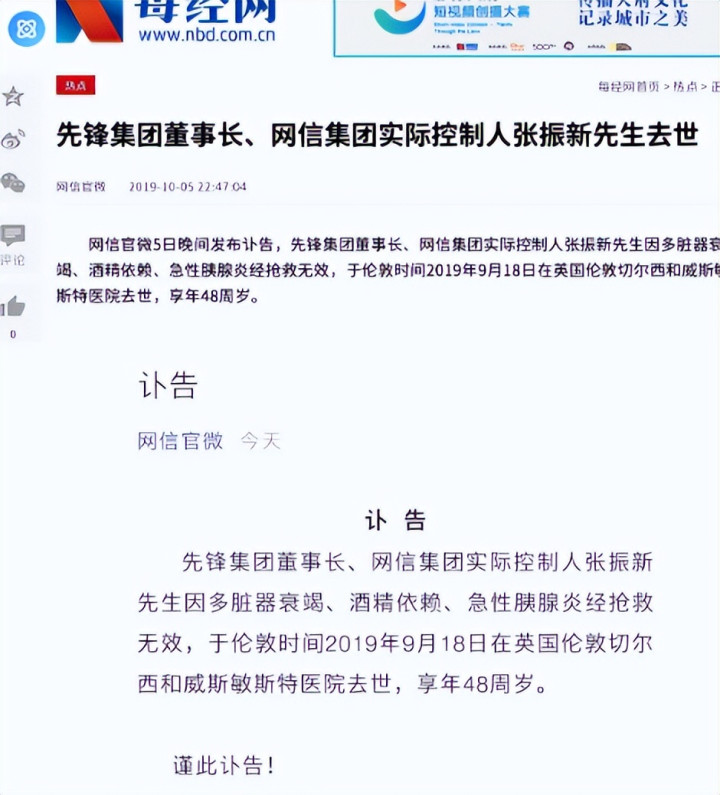 2019年9月18日,张振新在伦敦的家中因饮酒过量导致急性胰腺炎和多器官衰竭,抢救无效死亡。直到半个月后,国内才传出他的死讯。